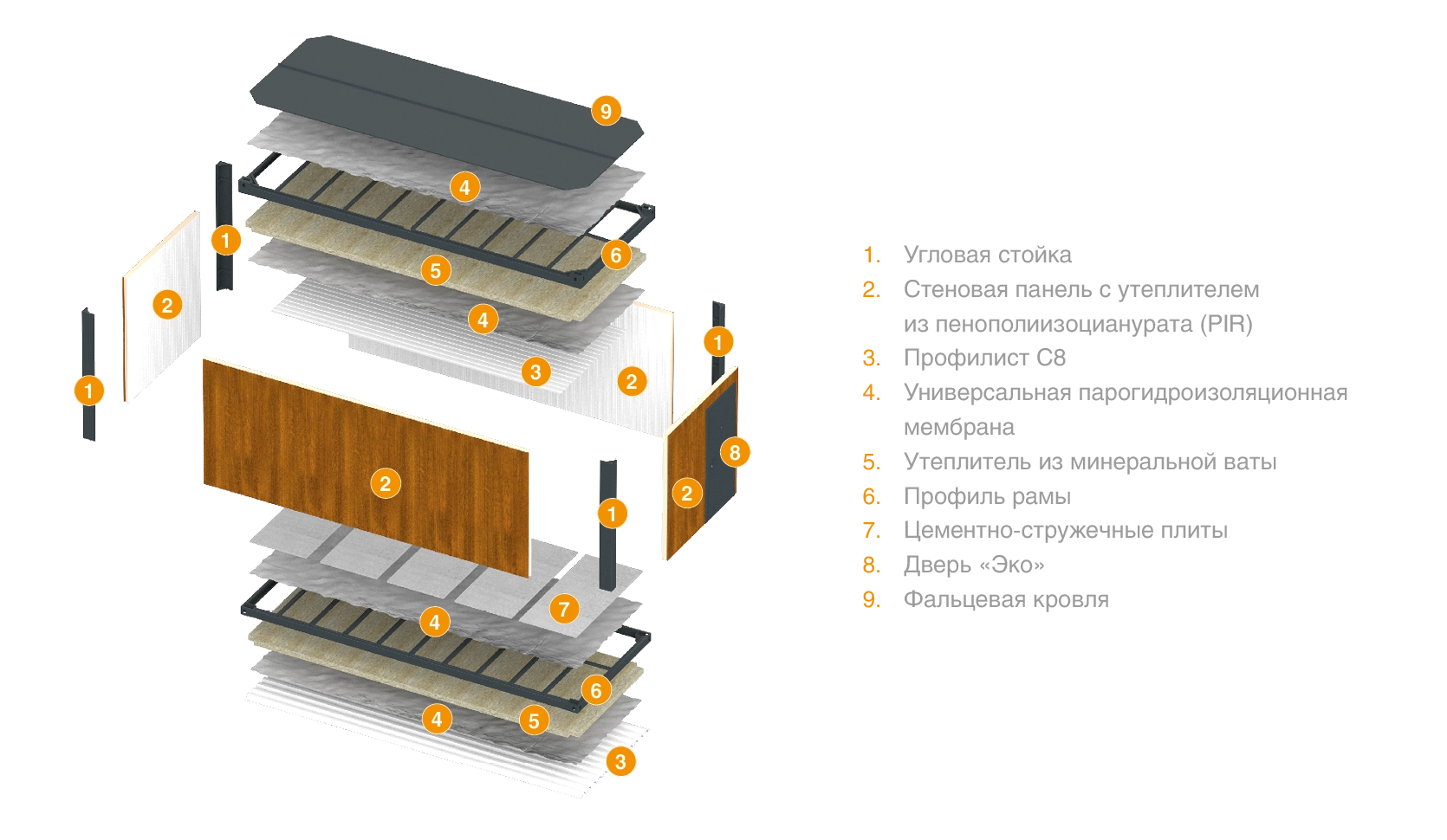 Винтовые соединения рам и угловых стоек, а также отсутствие монтажной сварки и заклепочных креплений позволяют выполнять быстрый монтаж и демонтаж модульного металлокаркаса хозяйственного блока в любое время года даже при неблагоприятных погодных условиях.