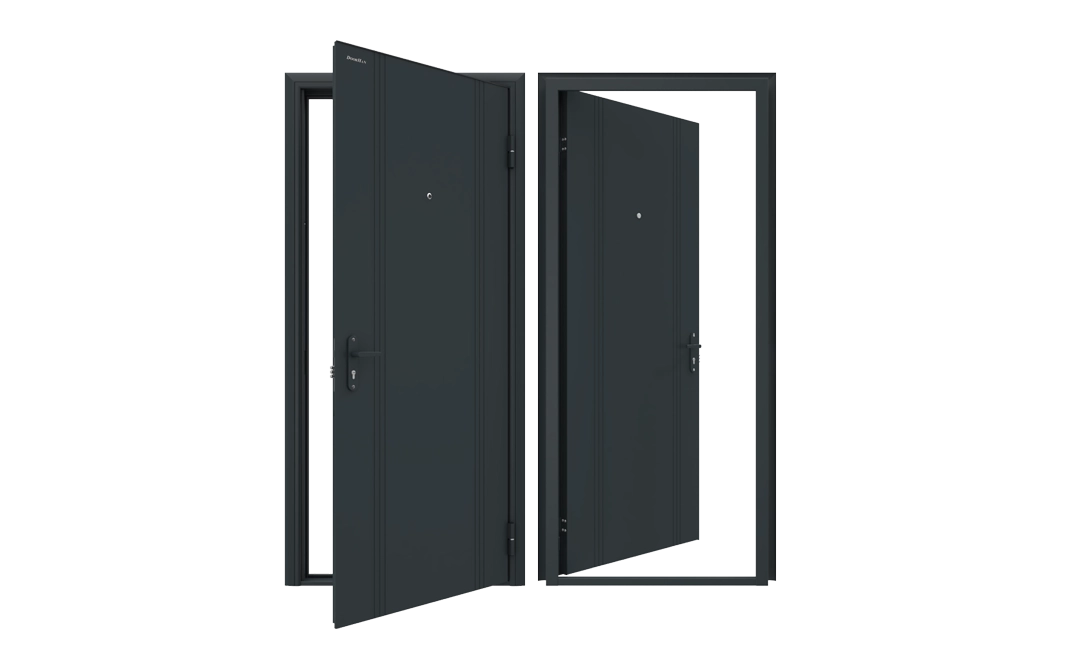 Бюджетный вариант стальной входной двери толщиной 60 мм, полотно которой имеет антивандальное порошковое покрытие с внешней и внутренней стороны в цвете RAL 7016 и декоративный оттиск «симметрия».