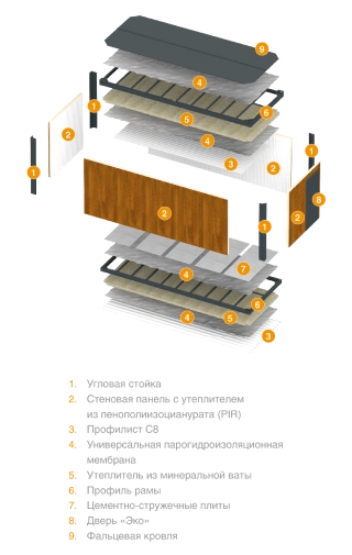 Использование 100 мм минеральной ваты в рамах основания и покрытия позволяет обеспечить теплоизоляцию эквивалентную 60 мм пенополиизоцианурата, а также взвешенный коэффициент звукового поглощения равный 0,8 aw. Использование парогидроизоляционной пленки качественного фальца в раме покрытия позволяет достичь полной гидроизоляции без использования дополнительных мембран.