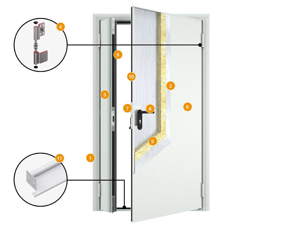 Коробка, полотно и пассивная створка двухстворчатой модели выполнена из оцинкованной стали по бесшовной технологии. Для утепления двери использована минеральная вата высокой плотности.