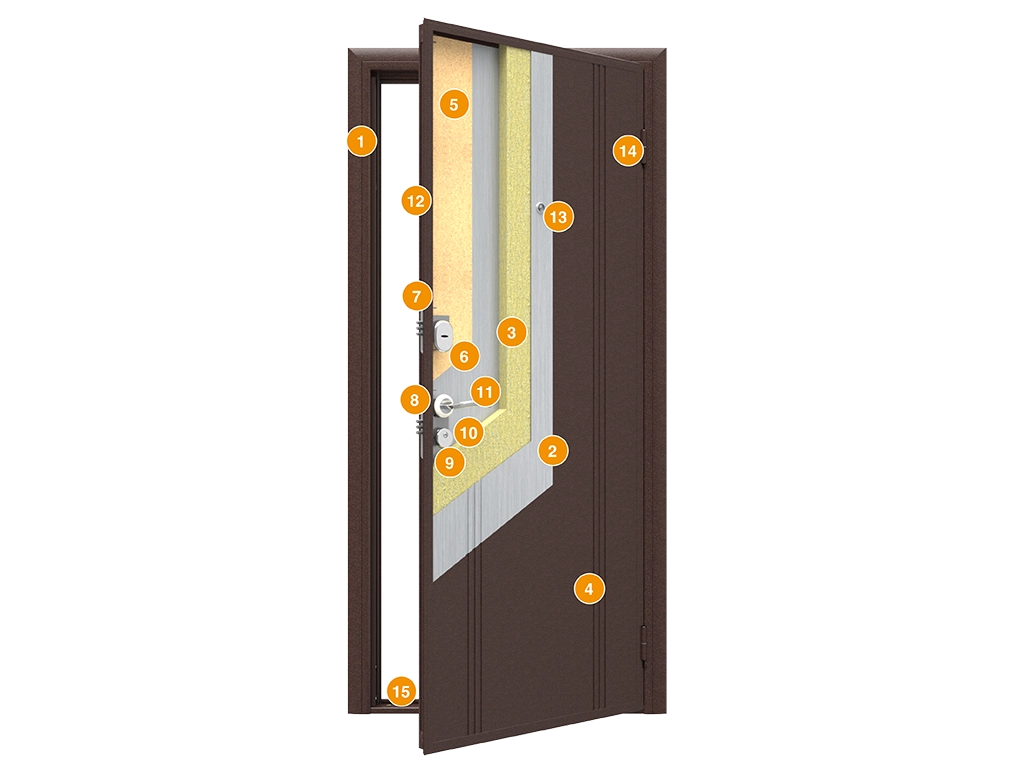 Это эстетичная модель входной двери ДорХан. Снаружи она покрыта антивандальным порошковым напылением цвета «антик медь» и декоративным оттиском «симметрия». Внутри дверь декорирована гладкой панелью с эффектом 3D.